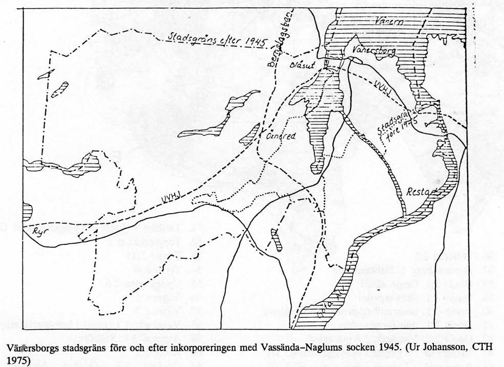 Huvuddelen av förutvarande Vänersborgs stad som omfattas av inventeringsarbetet utgörs av det som tidigare var Vassända-Naglums socken. Vänersborgs stad och församlings gränser före och efter 1945–47 framgår av nedanstående kartbild. 1945 införlivades större delen av dåvarande Vassända-Naglums socken med Vänersborgs stad, samt dess södra del med Trollhättan. 1947 skedde motsvarande förändringar inom den kyrkliga organisationen. Vänersborgs pastorat har sedan dess utgjorts av Vänersborgs och Väne-Ryrs församlingar. 1916, i samband med att Trollhättan blev stad, hade tidigare en folkrik del av Vassända-Naglum väster om Göta Älv (Strömslund mm) inkorporerats med Trollhättan. Samtidigt inkorporerades Vassbotten med Vänersborg.